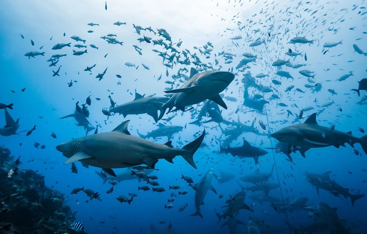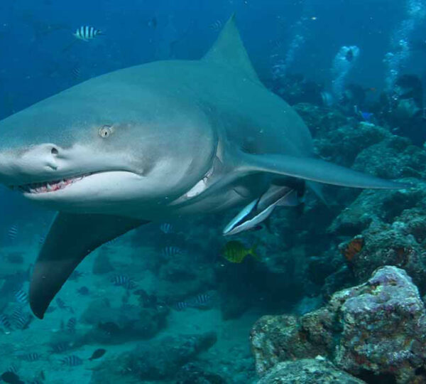 This dive features up to eight different species of shark: bull shark (largest in the world), whitetip reef shark, blacktip reef shark, nurse shark, lemon shark, grey reef shark, silvertip shark, and even the elusive tiger shark. This dive offers the chance to see over 300 species of fish. As divers descend through the clear waters to a landing at 18m/60 ft, they will see sharks circling below them along with hundreds of jacks, snappers and other fish species swirling around the feeding area. Some divers are rewarded with rare sightings of the huge queensland grouper and humphead wrasse. Divers are not in a cage, but situated on the reef around the perimeter of the dive site called "The Bistro." Once settled in, the feed begins. Tawny nurse sharks are abundant and not shy as they crowd around. Lemon Sharks attend in ones or twos. Silver tips dart in and out from the blue. The main attraction, the huge Bull Sharks, arrive in numbers as far as the eye can see. They purposefully move in, opening their enormous jaws to take food in direct view of the diving guests. After 20 minutes of bottom time, divers ascend up the beautiful reef ledge where grey reef, black tip and white tip reef sharks swim freely. After diving among the big boys (and girls), this part of the dive seems like the nursery.